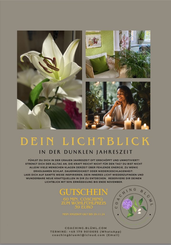 Hier mein derzeitiges Angebot – Zum Kennenlernen. Gültig für 60min Coaching – bis Ende November 2024